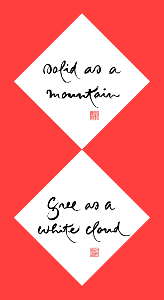 Aan het begin van het nieuwe jaar publiceert de Plum Village gemeenschap twee parallelle verzen, als uitnodiging voor een jaarthema in het oefenen in mindfulness. Stevig als een berg- vrij als een witte wolk. Met aandacht stevig gegrond aanwezig zijn en meebewegen met veranderen. Toelichting kun je hier vinden: https://plumvillage.org/articles/solid-as-a-mountain-parallel-verses-for-the-year-of-the-horse