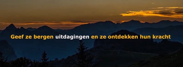 Een vriend van mij wees me op een film: Geef ze bergen. Verslag van de reis van een groep jongeren die het echt heel moeilijk hadden in hun (school-)leven naar Bosnië; een hike tocht in de bergen daar. Een zin die me raakte was: geef ze bergen uitdagingen en ze ontdekken hun kracht.